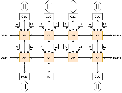 In the EU Pilot chip, the NOC-X serves as a connection network for its functional units. Its purpose is to connect the Atrevido RISC-V cores (A), the Home Nodes with their shared L2 caches, the LPDDR4 memory controllers and the PCIe controller (see Figure 1). Using EX_C2C links, the network can be extended to other chips.